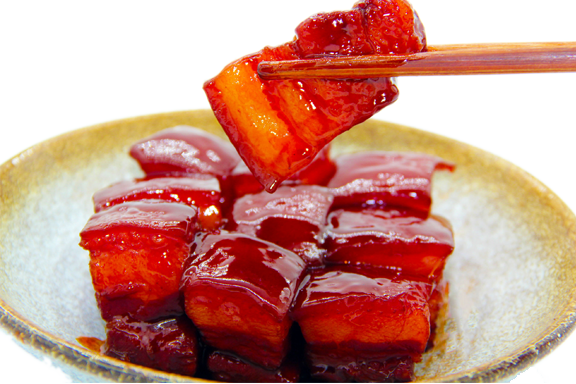 红烧肉,选用三层五花为原料,经清洗、去毛、切块后用骨里香配制的卤料烧制而成,成品色泽红润油亮,食之软嫩可口、肥而不腻;